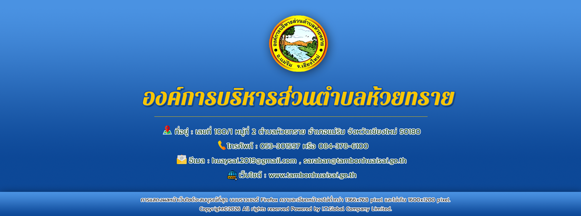 ยินดีต้อนรับเข้าสู่ ติดต่อสอบถาม องค์การบริหารส่วนตำบห้วยทราย : โทรศัพท์ : อีเมล์ :huaysai.2019@gmail.com , saraban@tambonhuaisai.go.th โทรศัพท์ : 053-301597 หรือ 084-378-6100